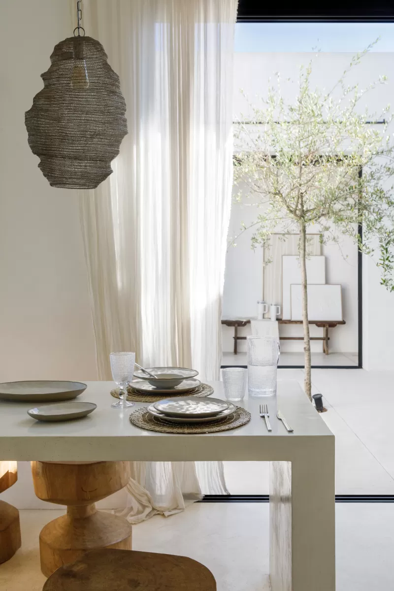 Si preferís una mesa sin mantel completo, otra opción ideal son los individuales de fibras vegetales (como yute o seagrass) o los platos de sitio de madera clara. Estos elementos cumplen la doble función de delimitar visualmente el espacio de cada comensal y, al mismo tiempo, introducir calidez y textura. El contraste entre una vajilla blanca lisa y una base en fibra orgánica puede elevar una mesa simple a algo sofisticado sin esfuerzo.