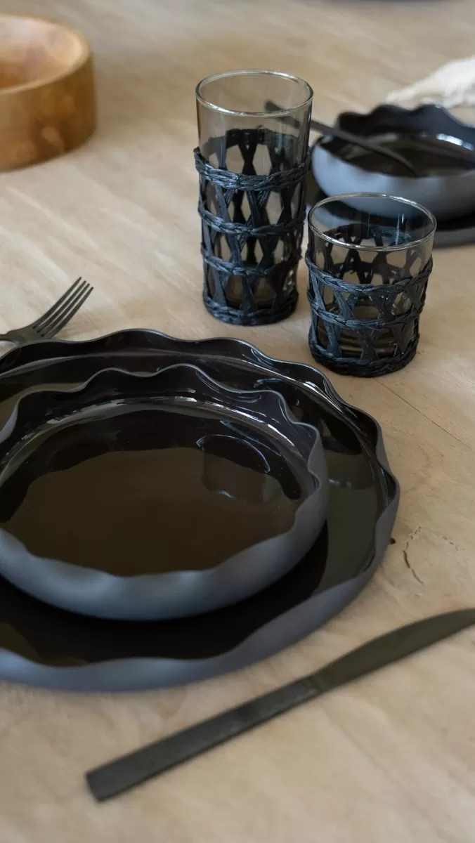 Otra tendencia en alza son los acabados mate. Ya sea en blanco, negro o en una gama de tonos tierra (como el visón, el gris cemento o el beige), los platos con terminación mate ofrecen una estética más cálida y táctil. Combinan perfectamente con cubiertos en acero cepillado o, mejor aún, con cubiertos negros mate. Este contraste entre lo claro y lo oscuro genera un efecto visual potente, pero sin estridencias.